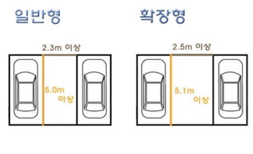 일반 주차 공간보다 약 5 배 정도 많은 것을 알 수 있으며, 넓은 주차 공간의 경우 대부분 각진 주차 공간 (45 ~ 60도)을 구성하여 출입이 발생하는 것이 많습니다. 일본의 경차 점유율은 40%까지 늘어났고, 경차 모델만 100여 종으로 엄청 많습니다. 유럽도 경차의 선호도가 높고 한국에서 찾아볼 수 없는 다양한 경차들을 판매 하고 있습니다. 경형의 경우 너비 2.0미터, 길이 3.6미터 이상 / 일반형은 2.5미터, 길이 5미터 이상 / 확장형은 2.6미터, 5.2미터 / 장애인전용은 3.3미터, 5미터 / 이륜자동차 전용은 1미터, 2.3미터 이상입니다.