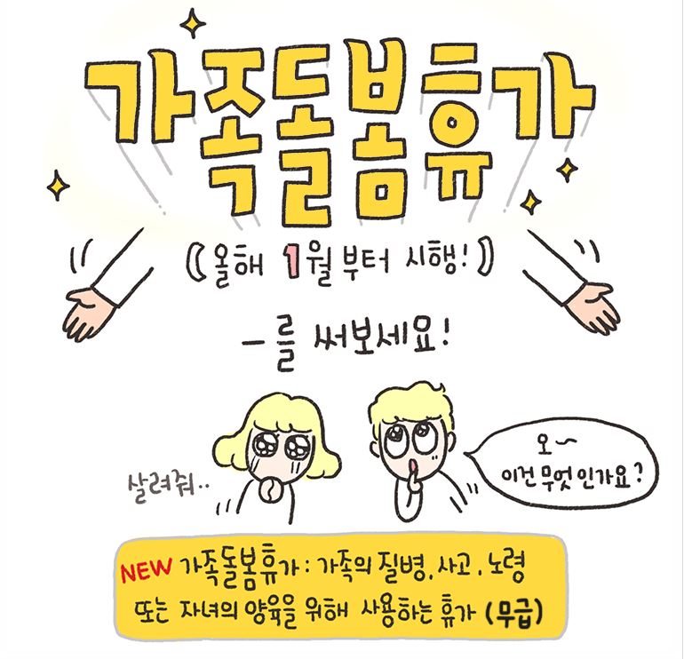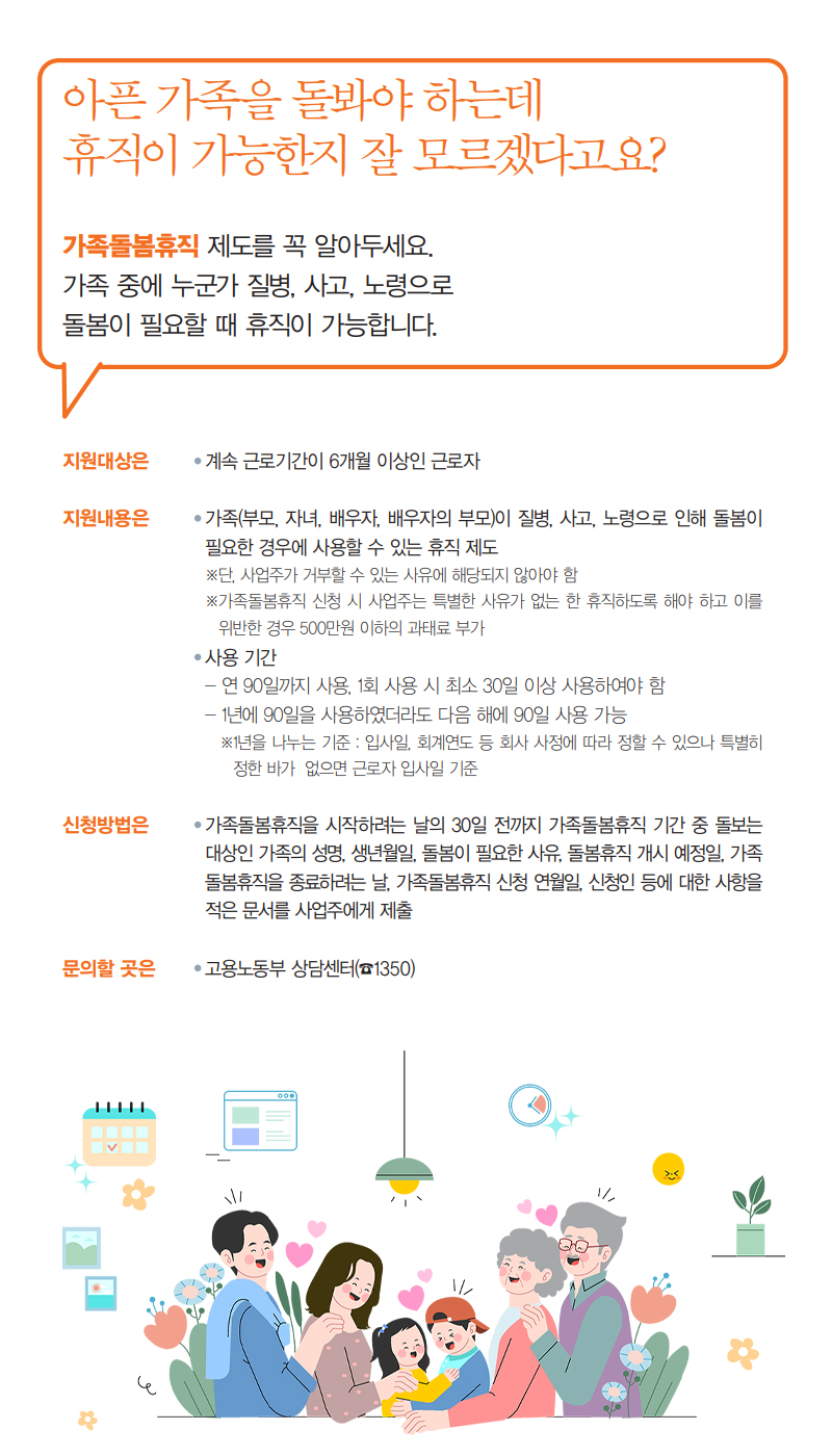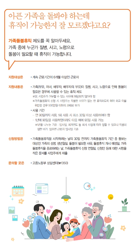가족돌봄휴직은 사업주의 동의를 통해 신청할 수 있으며, 근로자들은 가족돌봄을 위해 최대 1년 동안 휴직을 할 수 있습니다. 이는 근로자들이 가족들을 돌보고 지원하기 위해 일을 중단하거나 줄여 일할 수 있는 시간을 제공합니다.