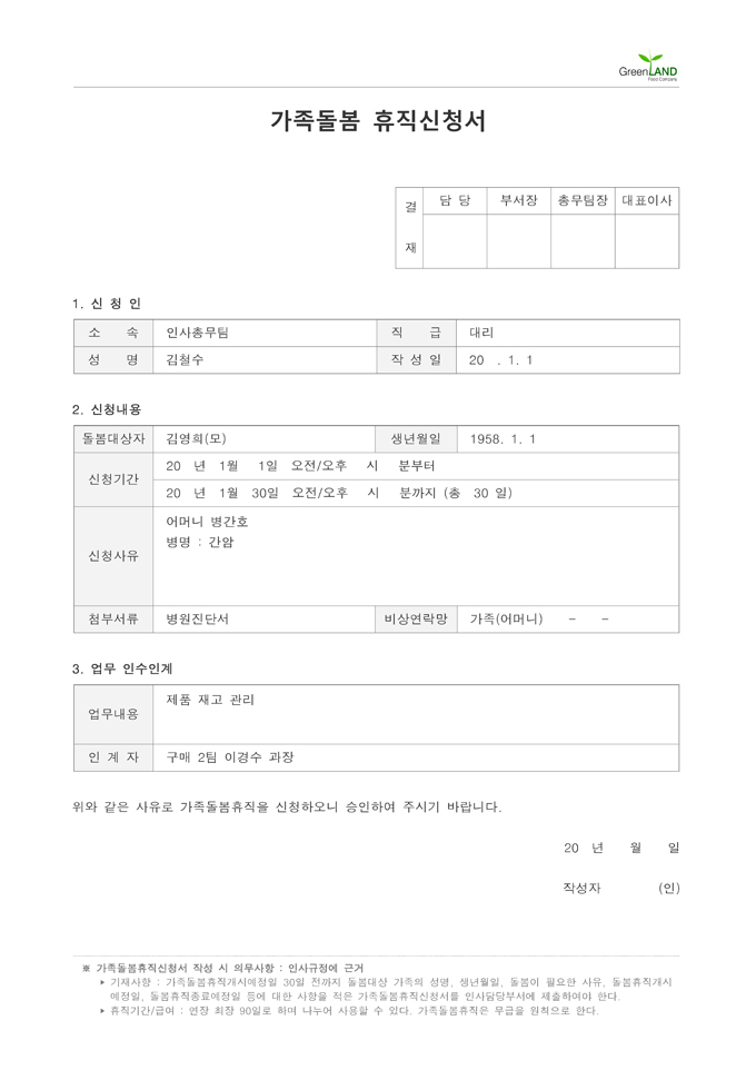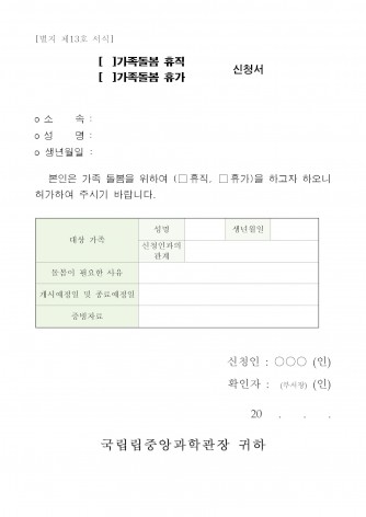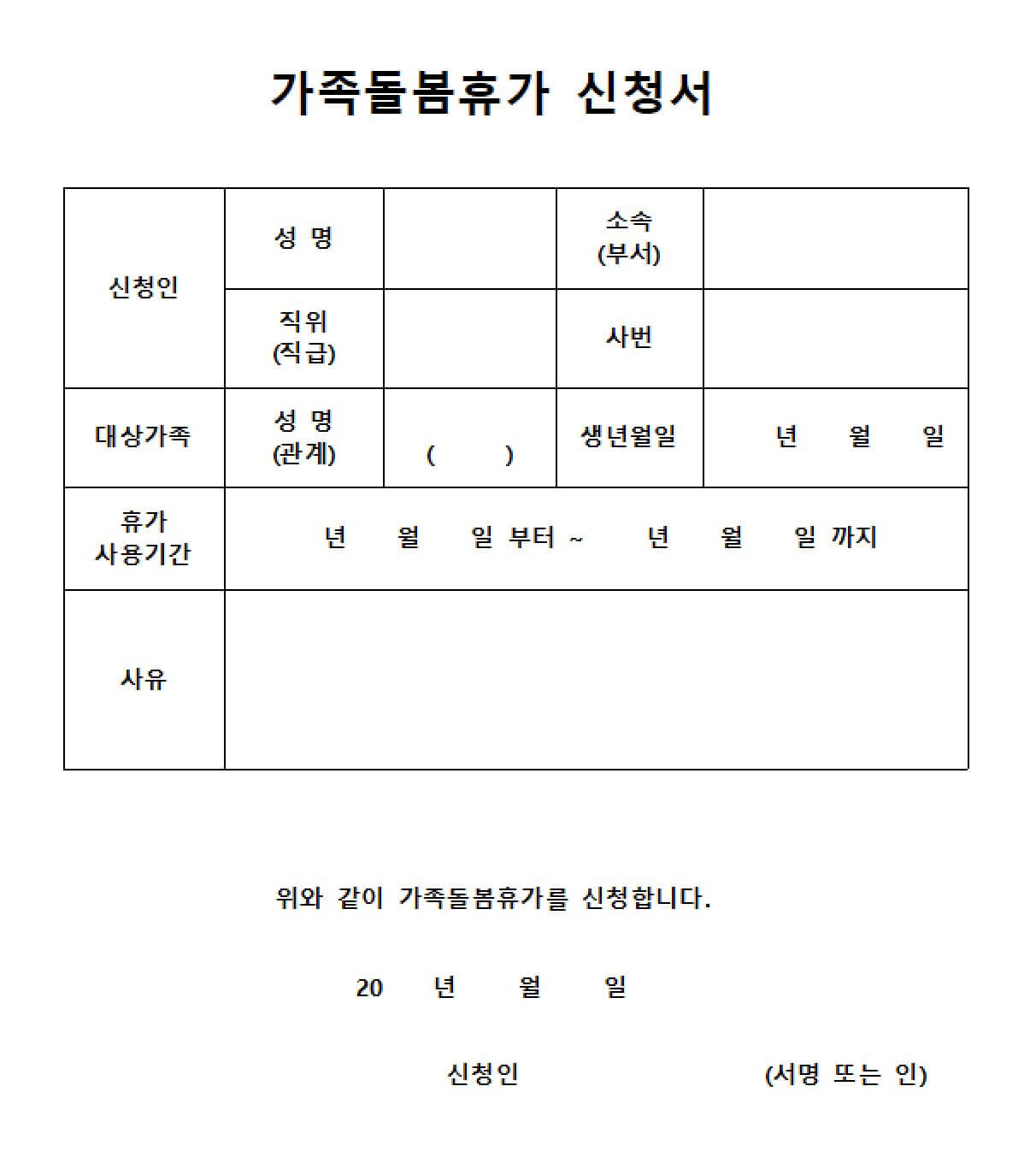 가족돌봄휴직을 신청하려는 근로자는 가족돌봄휴직을 시작하려는 날의 30일 전까지 가족돌봄휴직 기간 중 돌보는 대상인 가족의 성명, 생년월일, 돌봄이 필요한 사유, 가족돌봄휴직 개시의 예정일, 가족돌봄휴직을 종료하려는 날, 가족돌봄휴직 신청 연월일, 신청인 등에 대한 사항을 고용주에게 알려야 한다.