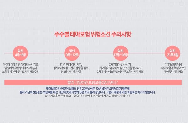 - 태아보험은 가입시기가 제일 중요하다고 생각합니다. 태아 관련 보장은 물론이며 출생 후까지 보장이 적용됩니다.