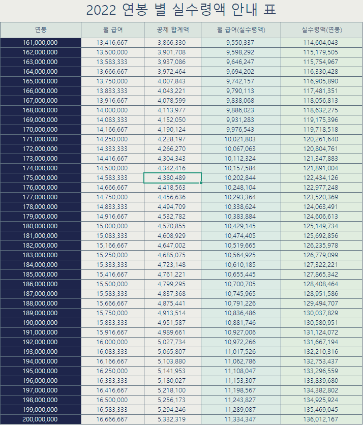 표를 통해서도 2022년 연봉실 수령액을 간단하게 확인할 수 있는 표도 있는데요.